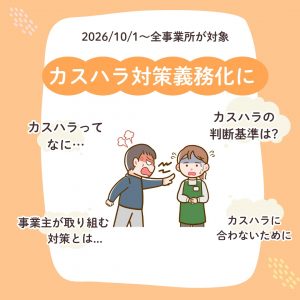 改正労働施策総合推進法により2026年10月1日から中小企業を含む全事業所で、職場における労働者がカスハラ被害に遭わないよう、必要な措置を講じることが義務付けられます。事業主は顧客の暴言や不当要求から従業員を守る体制整備(マニュアル・方針・窓口設置など)が求められます。罰則はありませんが、カスハラ対策は経営や従業員を守る上でも準備が必要です。