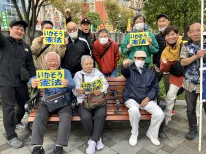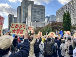 毎年11月3日の憲法公布日は、全国の各地で「総がかり集会」が行われ「軍拡反対の声」をあげました。