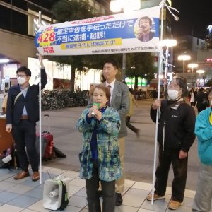 京橋駅での宣伝には清水ただし元衆議院議員を始め、民商の仲間や日本国民救援会の人たちなど22名が参加し、無実を訴え署名の協力を呼びかけました。2日間の行動で6か所を訪問し、禰屋さんの訴えに124名が参加、署名493筆と募金18万円が託されました。
