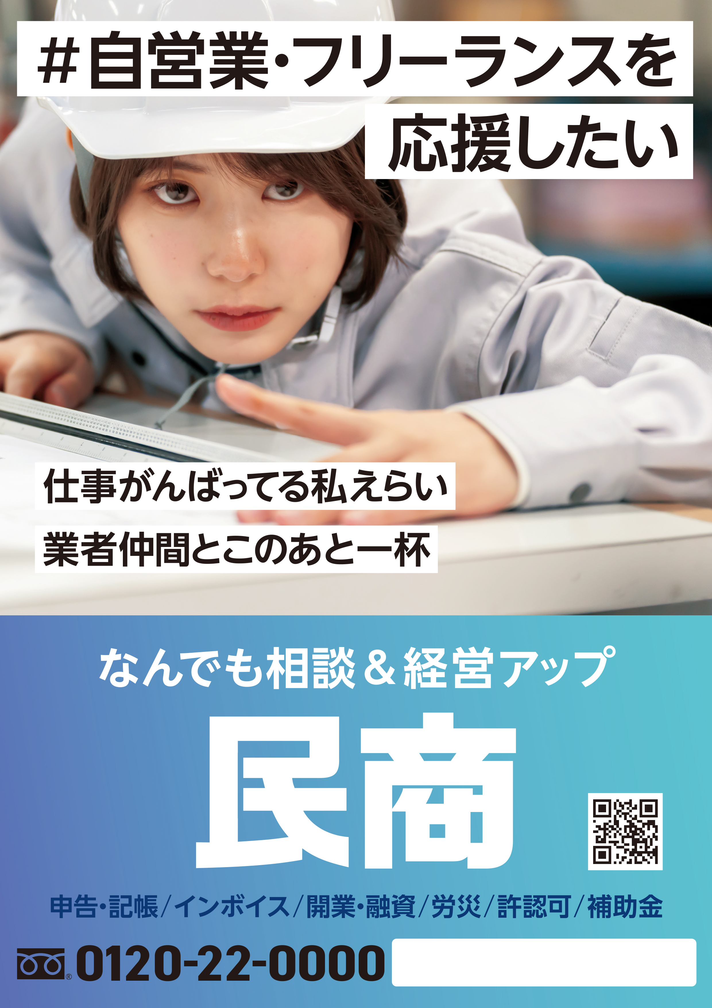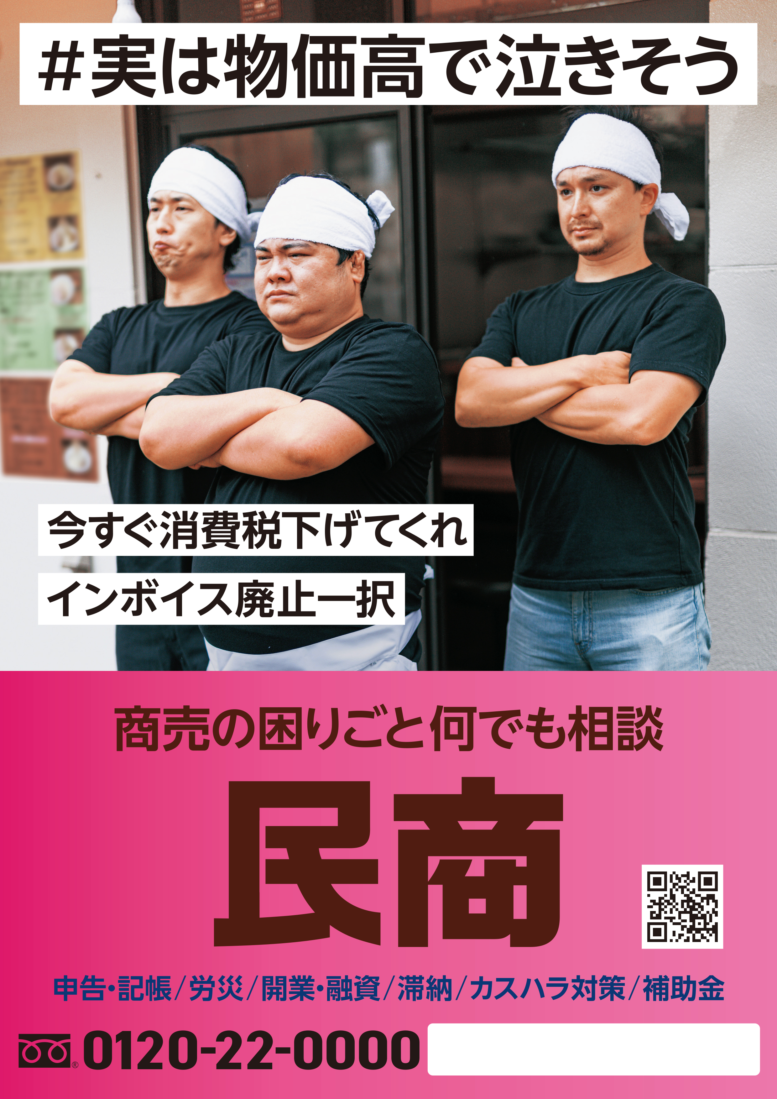 民商おおさかの2026年ポスターです。今年も自営業者の営業と生活を守るため全力で頑張ります。税金や記帳、資金繰りなど、商売の困りごとは民商へ相談を。